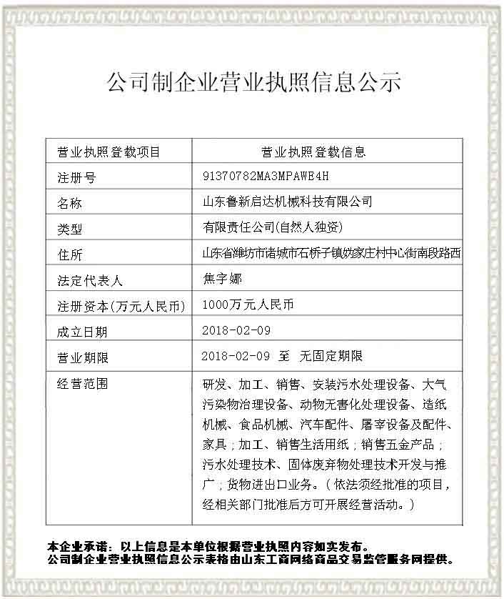 山東魯新啟達機械科技有限公司,坐落于沿海城市并有“中國龍城舜帝故里”之稱的諸城市石橋子鎮工業園,東鄰海濱名城青島,南毗新興港口城市日照,交通便利,環境優美。主要經營屠宰機械、污水處理設備、食品機械等設備。